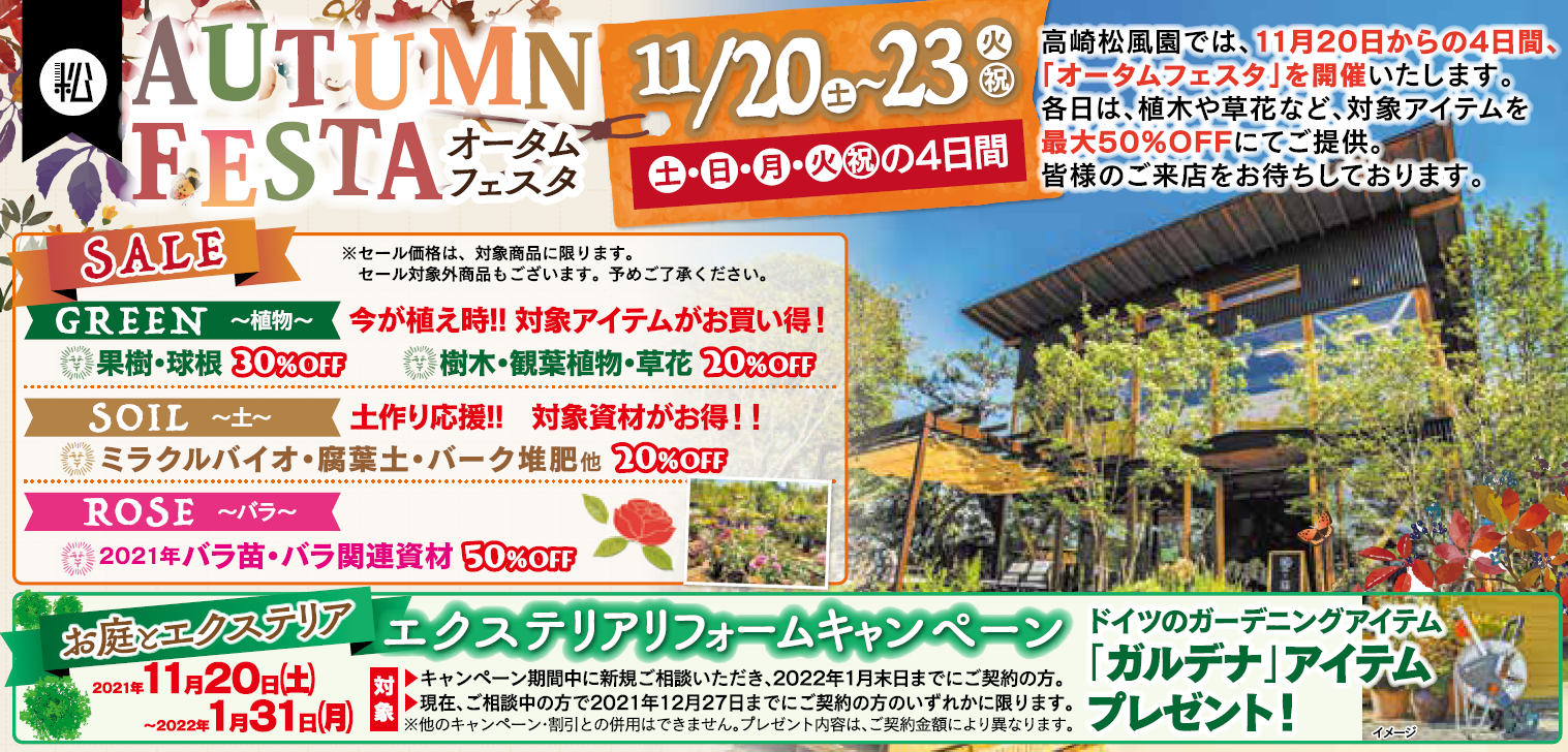 高崎松風園では、11月20日、21日、22日、23日の4日間「AUTUMN FESTA」を開催いたします。 4日間に限り…