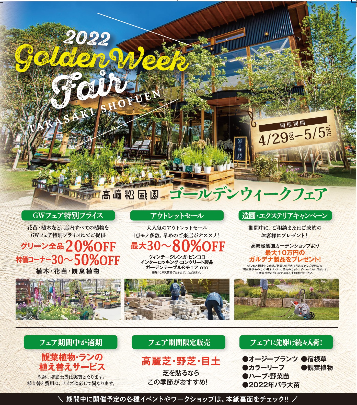 2022年4/29~5/5 ゴールデンウィークフェアを開催いたします。 期間中特別プライス グリーン全品20%OFF ア…